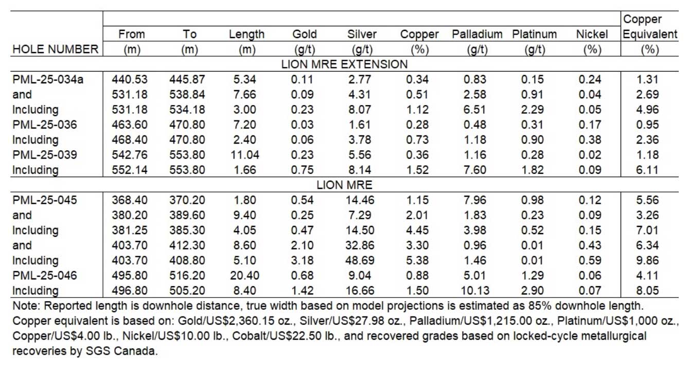 A particularly significant observation from the program is the strong contribution of precious metals to the overall grade. In hole PML-25-046, initial core logging suggested relatively modest copper mineralization, averaging 0.88% Cu over 20.4 meters. However, assays revealed substantial palladium values averaging 5.01 g/t, along with platinum and gold, materially enhancing the copper-equivalent grade. This underscores the polymetallic, orthomagmatic character of the Lion deposit and highlights the importance of refined geological logging procedures to better identify precious metal-rich zones within the system.